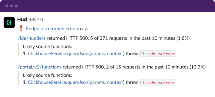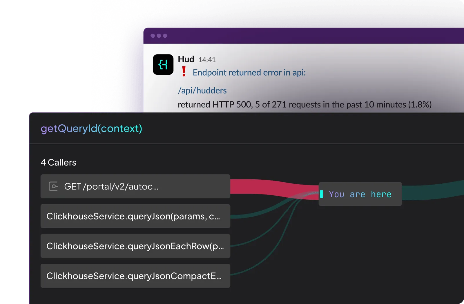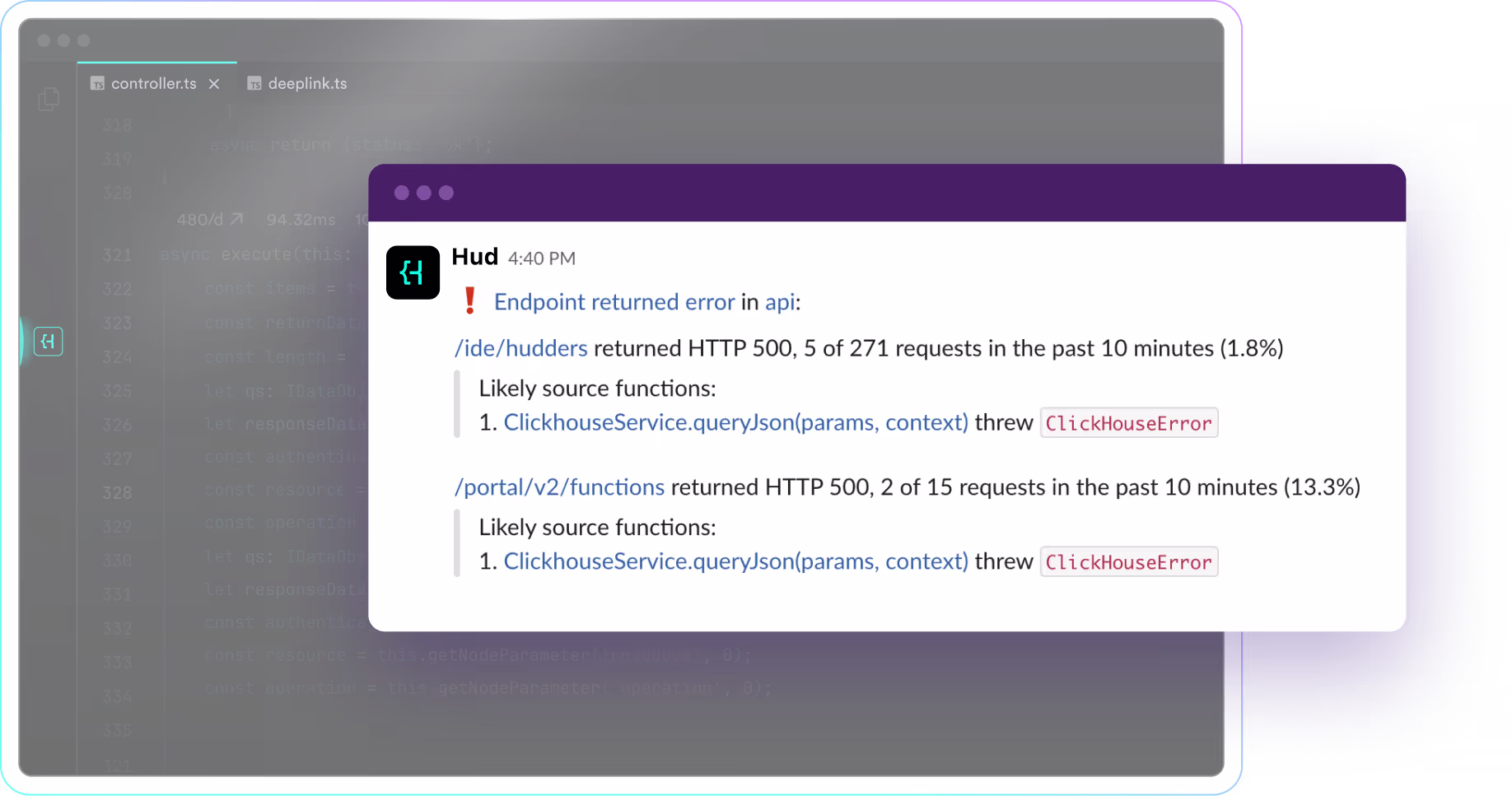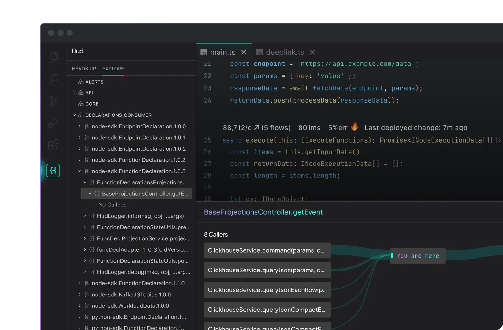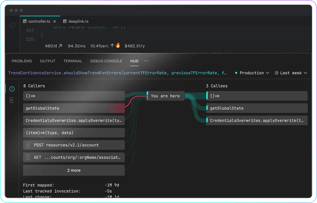 Using Hudders, you get live production insights - call volumes, error spikes, duration trends - overlaid on each function in your IDE. If something's on fire, engineers see exactly where the flames are.