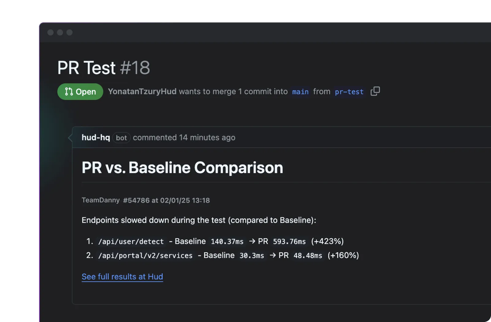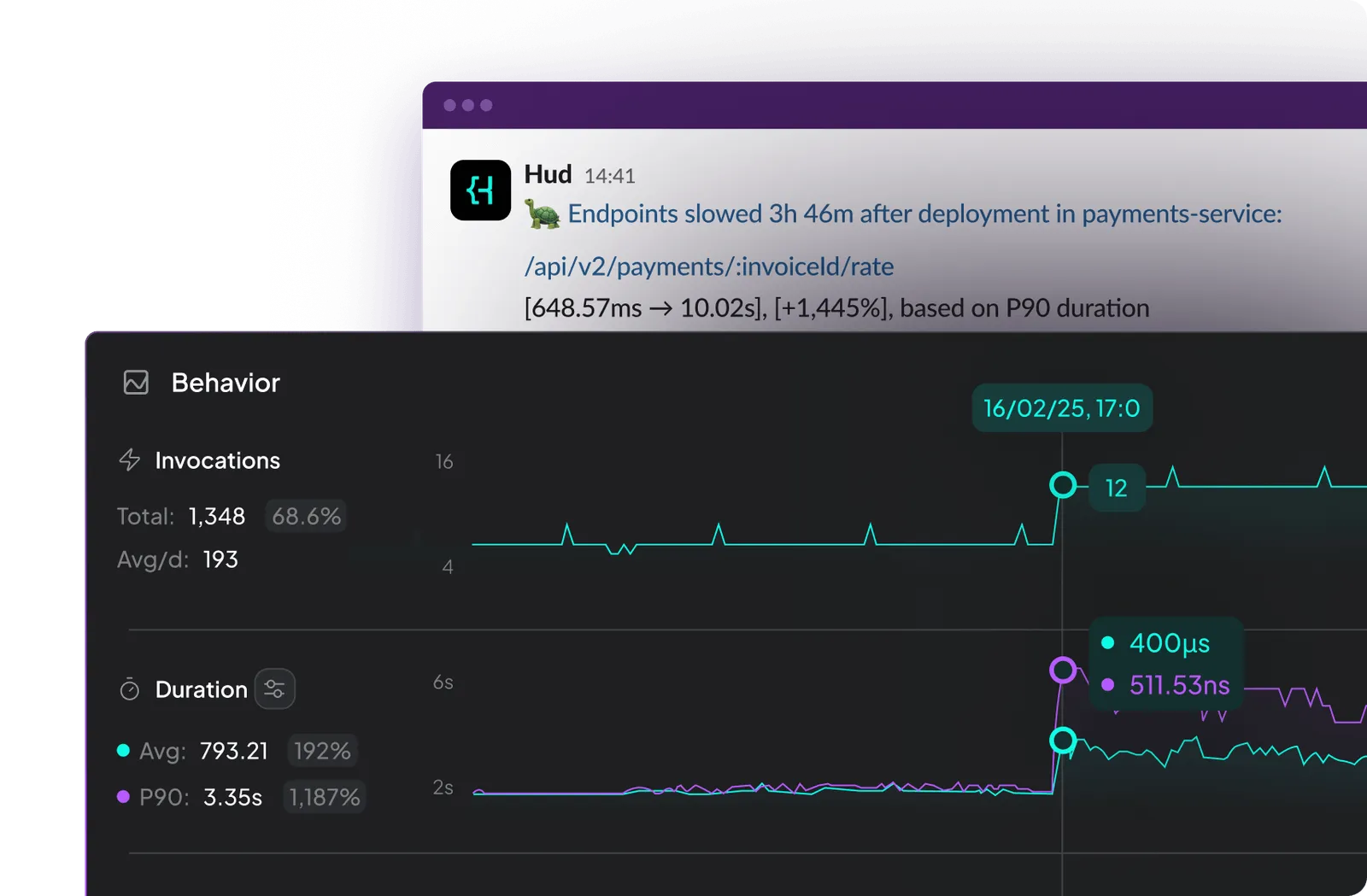 Add a single SDK init line - no agents, no extra configuration. Hud automatically adapts to code changes and new versions, so once you install it, you never worry about upkeep.