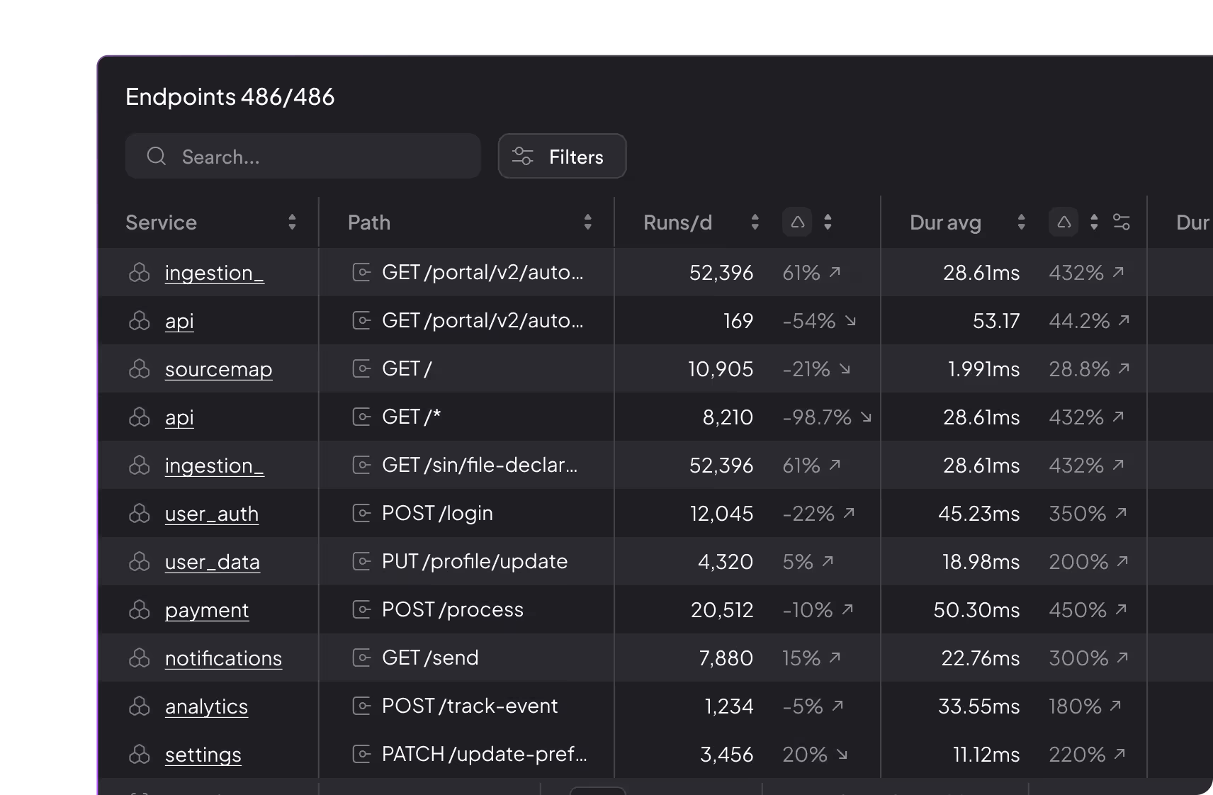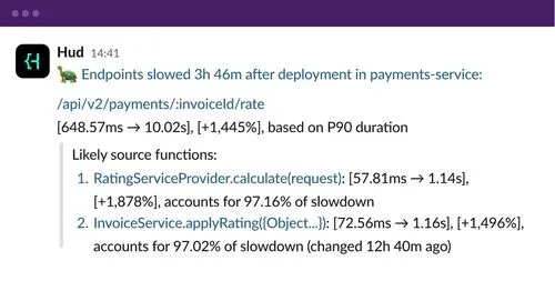 Detects degradations, slowdowns, and errors the moment they emerge in production, with their root causes already figured out. Engineers are alerted to business issues before they impact customers, and bypass the need to research where the issue is coming from.